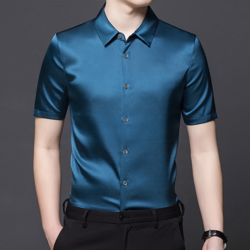 2023 High Quality Business Stand Collar Silk Shirt For Men Solid Color 90.4% Silk Short Sleeve Men's Shirt