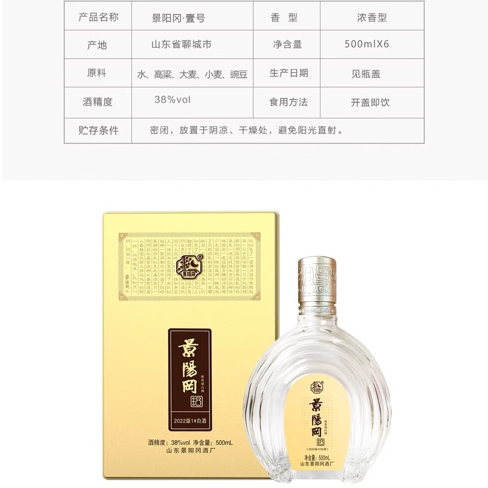 Jingyanggang Liquor No. 1 Liquor Bottle Jingyanggang Lai Mao Pure Grain Brewing Shandong Specialty Liaocheng Local Famous Liquor 53% 500mL 6 Bottles Lai Mao Sauce FCL